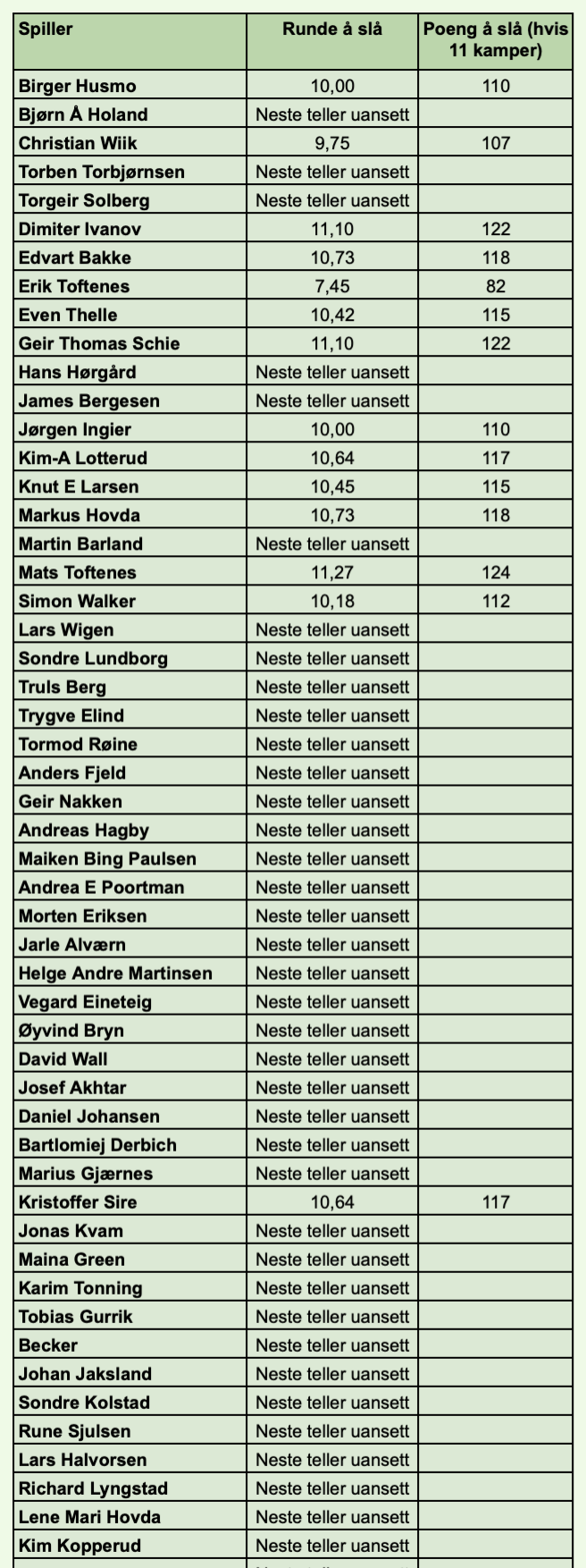 Tabellen under viser din svakeste tellende runde, det vil si hvilket snitt og hvilken poengsum (gitt 11 kamper pr runde) du må slå for å forbedre snittet ditt og avansere på serietabellen.
