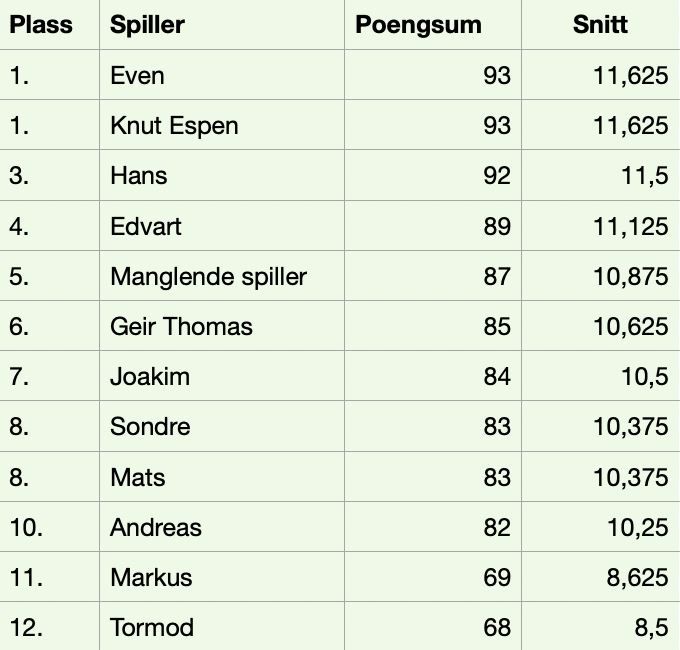 Sluttabellen for denne runden Matsicano blir da som følger: